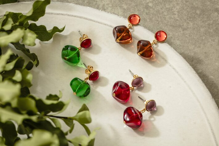 生き生きとした透明感と光のゆらぎが人気の、まるでキャンディのような「バイカラーガラス」シリーズに、新たな配色が加わりました。ホリデーシーズンらしい鮮やかな色の組み合わせが、顔まわりをぱっと明るく照らし、着こなしに季節感と華やぎを添えます。揺れ感が醸し出す柔らかな光をお楽しみください。ピアス・イヤリングで展開し、ギフトにも最適なアイテムです。