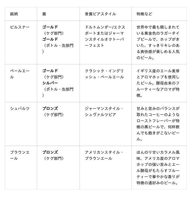 さらに、定番銘柄「ペールエール」がクラシック・イングリッシュ・ペールエールスタイルのケグ部門で銘柄初のゴールドを受賞しました。「ペールエール」は同スタイルのボトル・缶部門でシルバーも受賞。そのほか定番銘柄の「シュバルツ」と「ブラウンエール」がケグ部門(※ビアスタイルは下の表を参照)でブロンズをそれぞれ受賞し、合計6つのメダルを獲得しました。