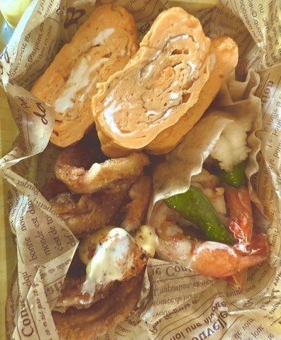 英字ラッピングで仕切られたおかずには、定番の卵焼き、リング型の揚げ物、エビと緑色野菜の炒め物など、食欲をそそられるメニューが詰められています。
