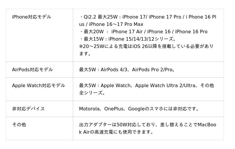 ESRが2022年に開発した独自の「CryoBoost(R)冷却ファン」により、充電時に発生する熱を最大約6℃抑え、Apple純正35Wケーブル充電と同等のスピードを実現します。さらに、標準化団体Wireless Power Consortium(WPC)が2025年7月に正式発表した新しいワイヤレス充電規格「Qi2 25W」とCryoBoost(R)冷却ファンを組み合わせることで、充電効率を最大限に引き出します。