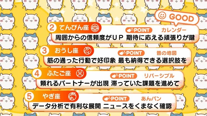 『めざましテレビ』で放送中の「ちいかわ占い」 テレビ放送がない日はお休みで、月~土:朝7時以降に更新予定です。