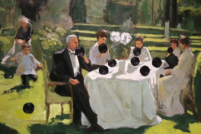 お庭で優雅に食事をしているようですが、女性の手元や男性の口元に、黒くて丸いものが塗りつぶされています。子どもが追いかける先にも、黒い丸。