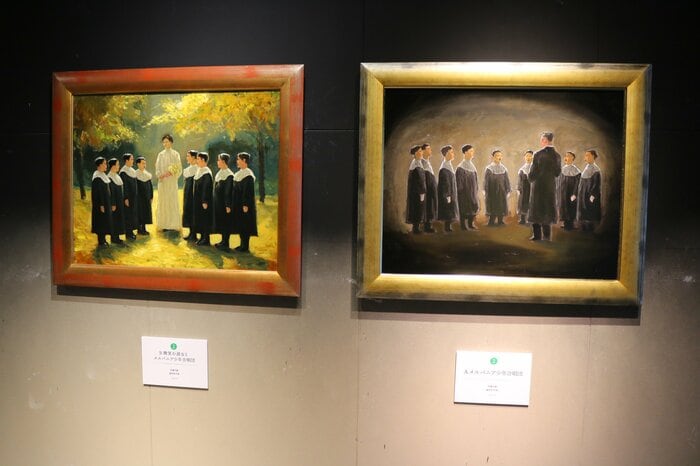 教会の下に集められた児童養護施設の子たちなんだそう。洞窟のような空間で指導者の男性を前に歌う様子や柔らかな日差しが差し込む場所で淑女を囲んで歌う様子が描かれています。