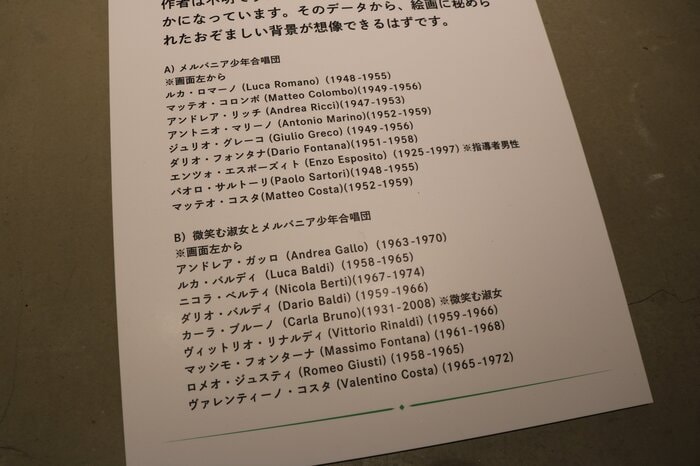 一見なんともない絵画ですが、生没年が書かれた資料を見ると「ルカ・ロマーノ(1948-1955) マッテオ・コロンボ(1949-1956)…」と、どの子ども達も6・7歳前後で亡くなっていることが分かります。