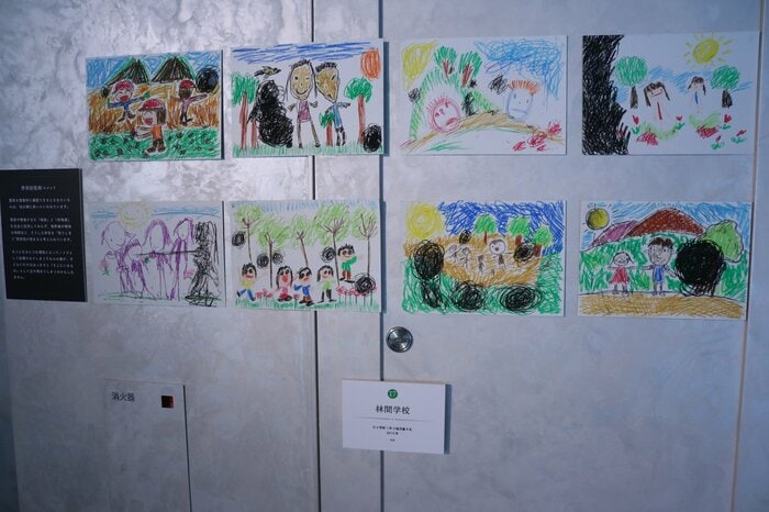 明るい雰囲気に不釣り合いな黒いモヤが色鉛筆で描かれた、小学1年生の児童たちによる絵画や…。
