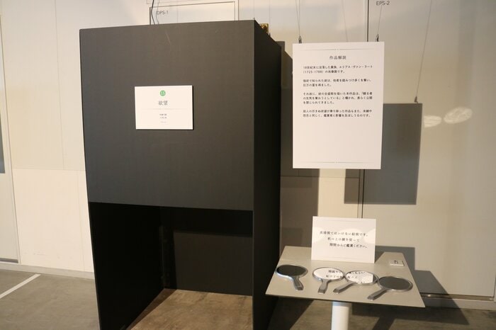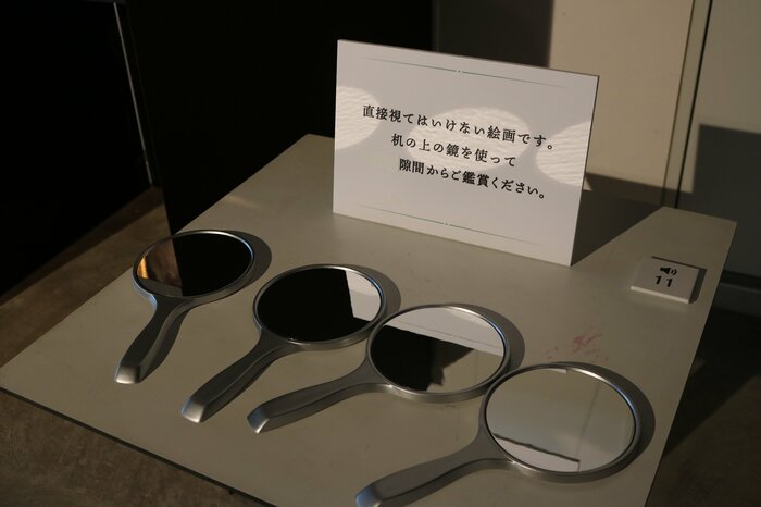 「直接視てはいけない絵画です。机の上の鏡を使って隙間からご鑑賞ください。」と書かれていて、自分で手鏡を持って確認してみないといけないそう!