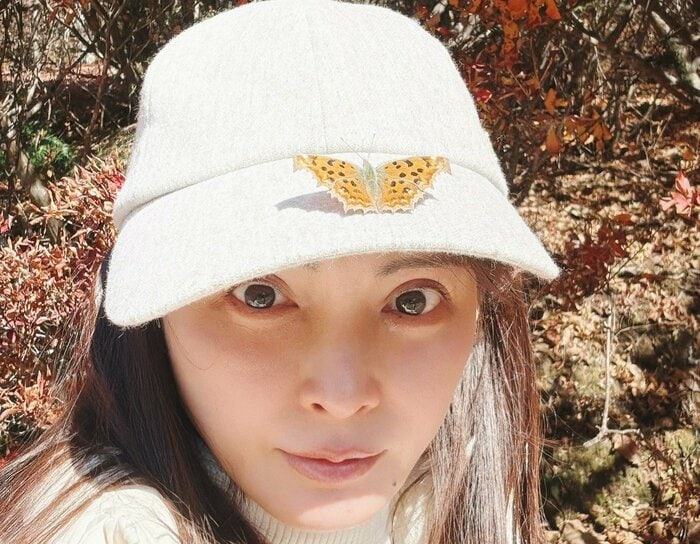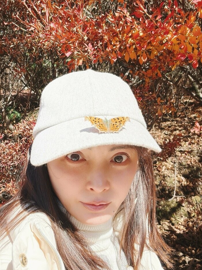 紅葉をバックに自撮りをする押切さんですが、かぶっていたキャップに蝶々がとまっています。かなりキレイになじんでいて、キャップのデザインだと勘違いしてしまうほど!