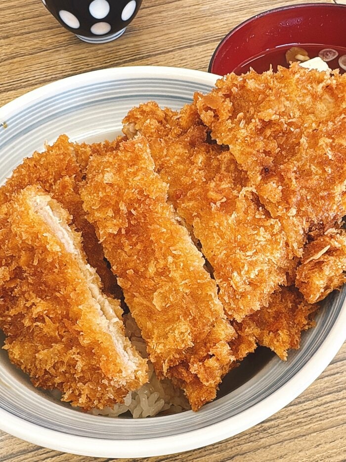 写真には、大きな器にどっしり盛り付けられた「名物のわらじカツ丼」が収められ、良い香りが漂ってきそうです。