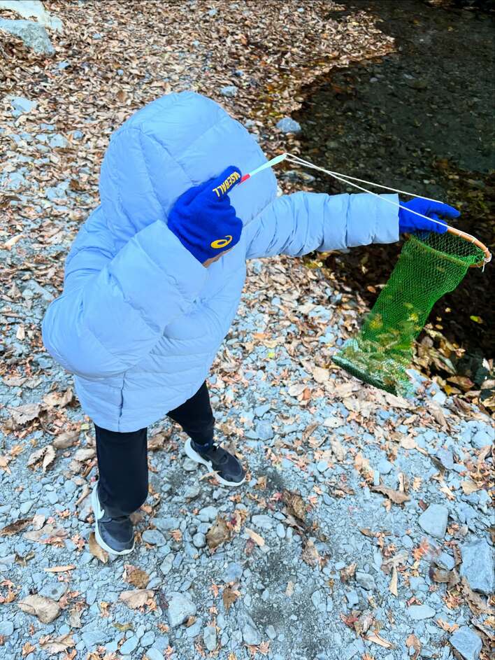 押切さんによると「なんとかニジマス1匹釣れた!」そうで、水色のダウンジャケットのフードをかぶった長男は、見事にニジマスをゲットしています。