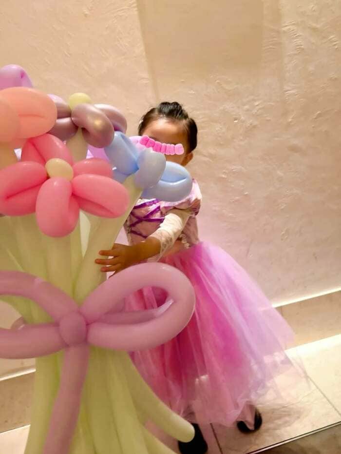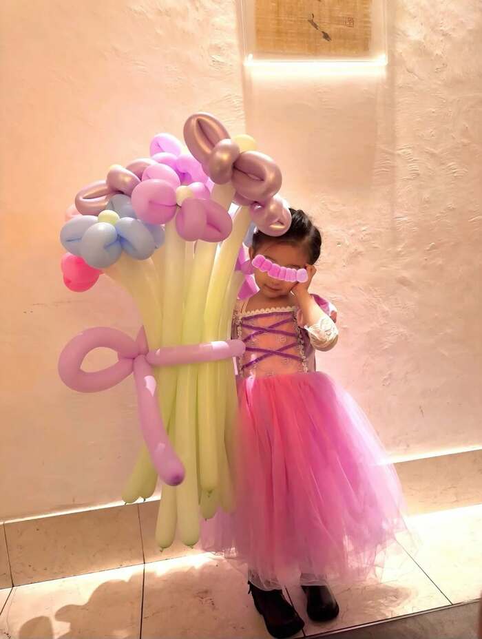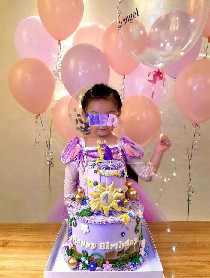 大好きなラプンツェルのドレスを身にまとったベビちんは、これまたラプンツェルをイメージした豪華で大きな2段のバースデーケーキと一緒に記念撮影。ベビちんの後ろにもピンクやパープルの風船たちがプカプカと浮いています。