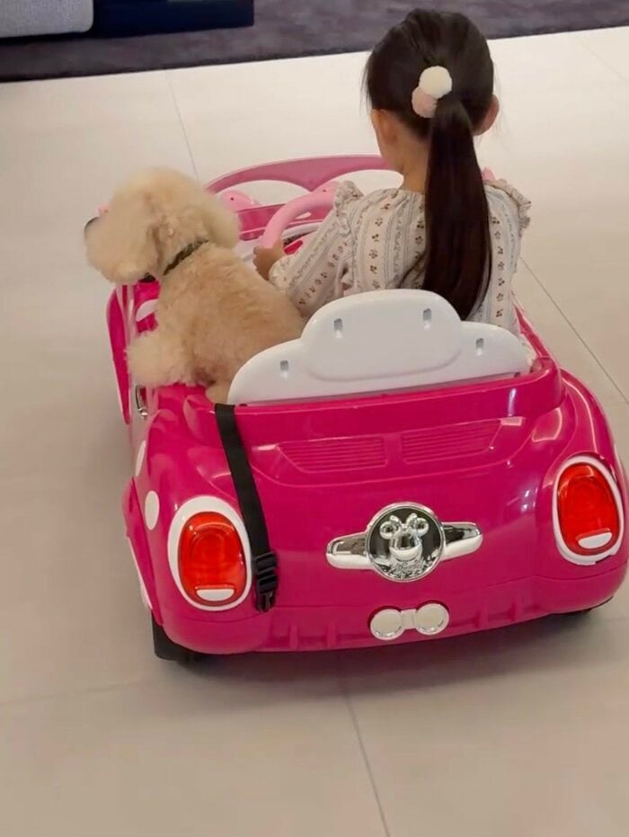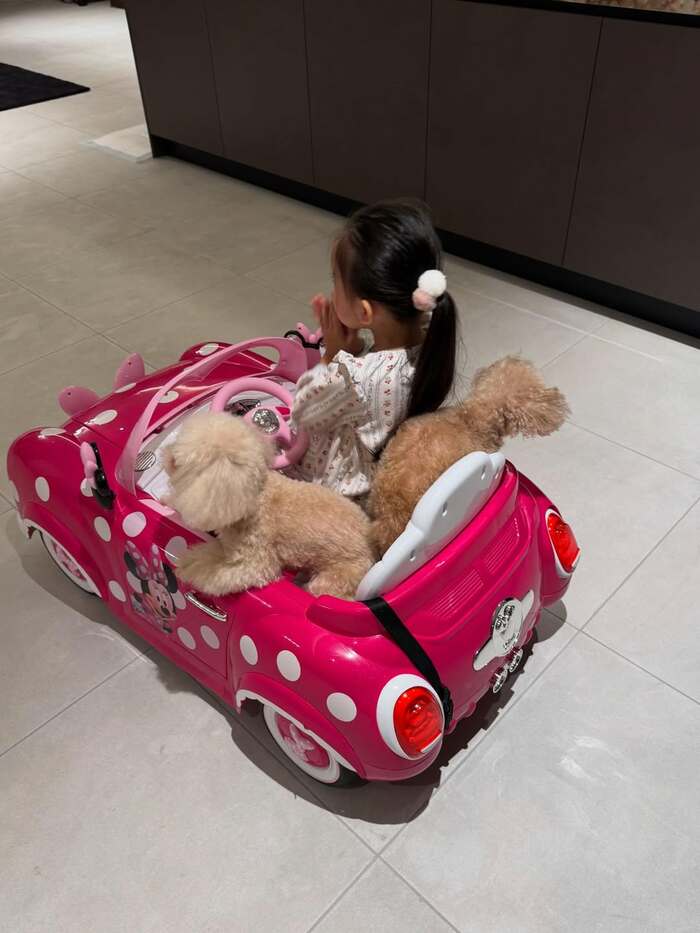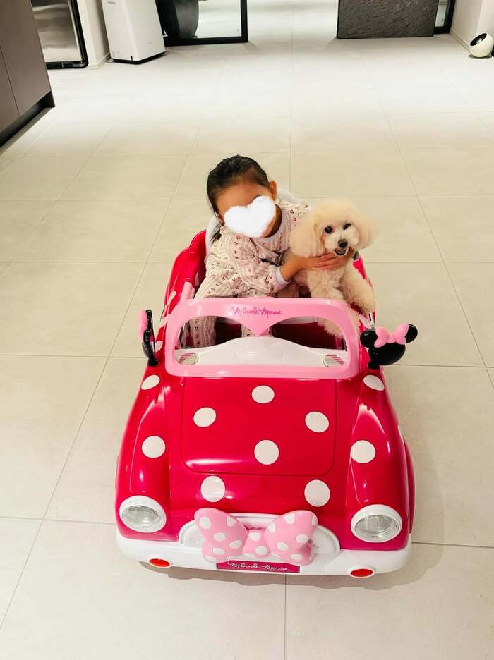 「クーちゃんとチーちゃんも気に入って一緒に乗ってくれました」と、実際に走らせることもできるこの車に2匹の愛犬と一緒に乗り込み、部屋の中を走らせるベビちんの姿も披露しています。