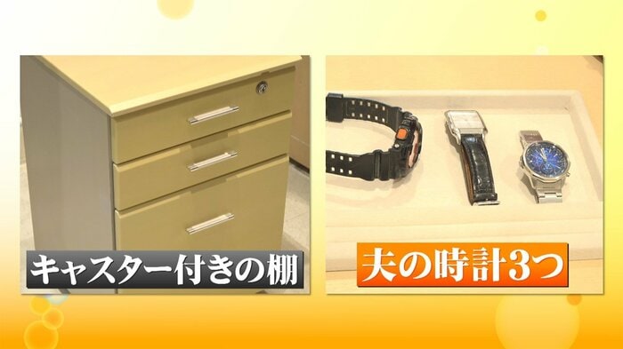 持ってきたのは、引き出しが3つ付いたキャスター付きの棚と夫の時計3つです。