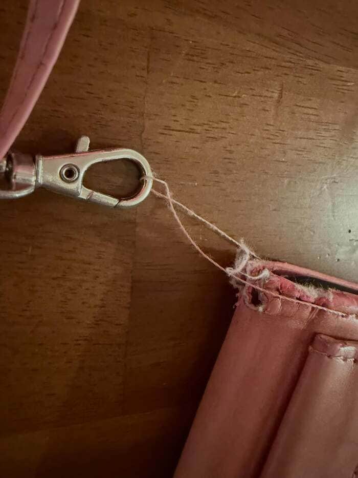そして、2枚目の写真では、スマホケースと持ち手をつなぐ部分が、細い糸1本だけでつながっているではありませんか!