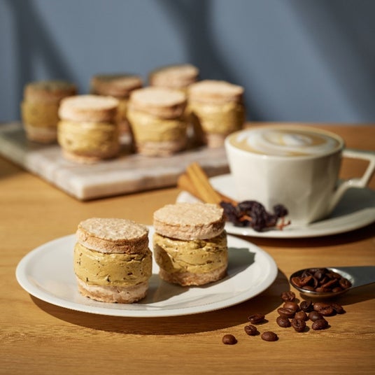 ラムレーズンを練り込んだカフェラテ風味の発酵バタークリームを、ほんのりとシナモンが香るサクサクなダックワーズ生地でサンドしました。華やかなカフェラテの薫りのなかに、ラムレーズンとシナモンのアクセントが楽しめる、とても濃厚で贅沢なお味の逸品です。