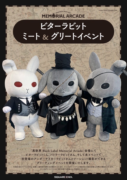 「黒執事 Black Label Memorial Arcade」開催を記念して、ビターラビットくん、バトラーラビットさん、そして本イベントで初登場のアンダーテイカーラビットさんとツーショット撮影ができるグリーティングイベントを「黒執事 Black Label Memorial Arcade」会場にて開催いたします。