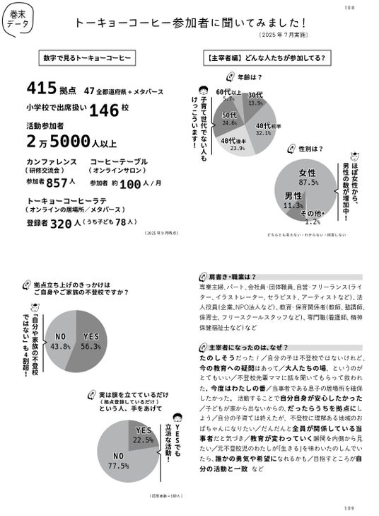 - 本書の刊行に合わせて参加者アンケートを行い、トーキョーコーヒーの活動や不登校の実態をデータで紹介するページも作成。子どもたちや保護者のリアルな声を伝えます。