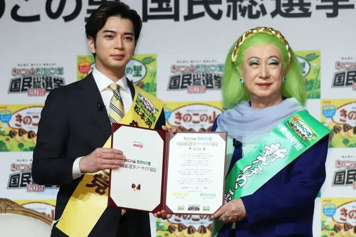 嵐の松本潤と美輪明宏が、12月17日(火)都内で開催された「明治きのこの山・たけのこの里 国民総選挙2019結果発表&新CM発表会」に登壇した。