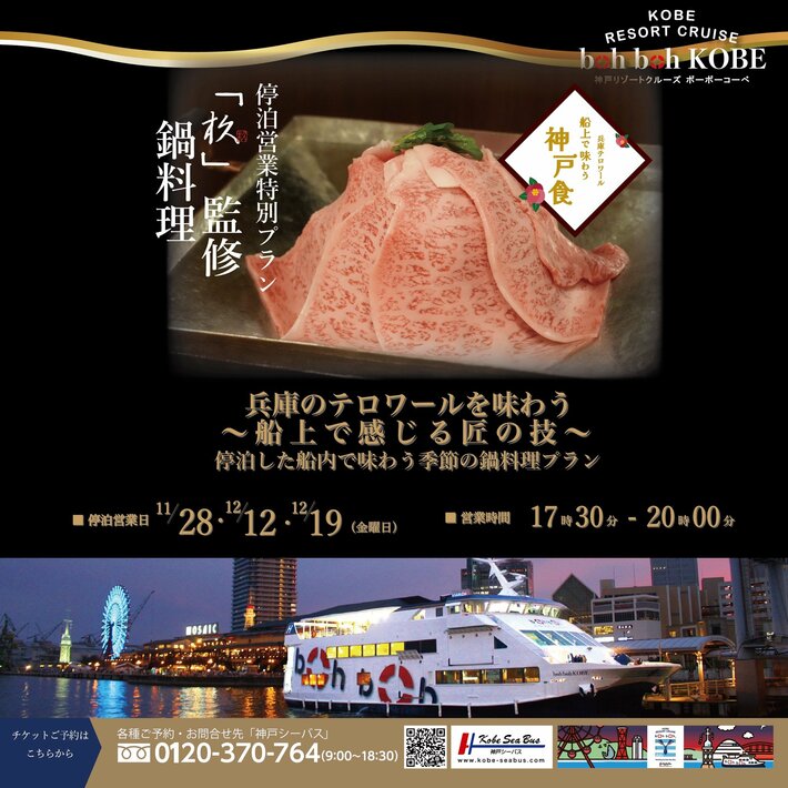 神戸シーバス boh boh KOBEでは11月28日(金)より、金曜日の停泊営業にて、兵庫×京都テロワールを味わう特別プラン『「杦」監修 鍋料理』を販売いたします!