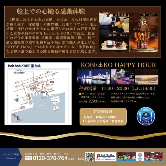 さらに、兵庫湊川隧道貯蔵酒「隧」や、食後には酒粕入りの KOBE Dora、お抹茶をご自身で点てていただける「お抹茶体験」もご用意しております。神戸港の船上で心踊る感動体験をお届けいたします。