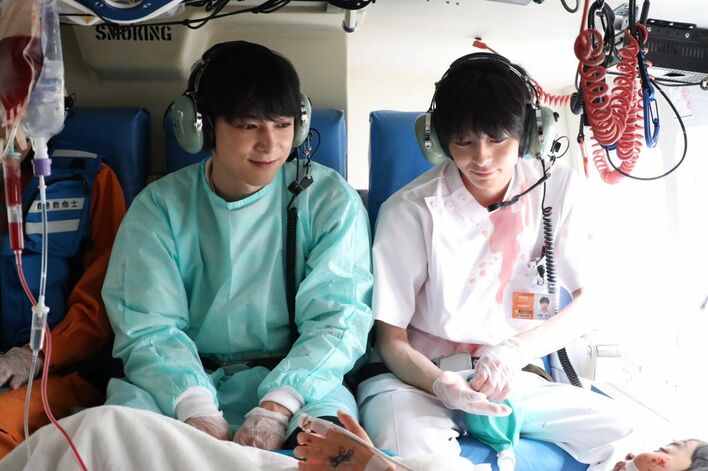 第3話で、患児を演じた子役(松野晃士)との、ドクターヘリの中での緊迫したシーン。その裏側では、仲良く会話を楽しむ3人の姿がありました。