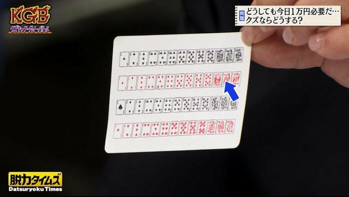 マリックさんは「賭ける」と解答。山添さんが引いたトランプの絵柄を“当てる”というマジックで、全種類の絵柄が書かれた1枚を用意して、何を言われても当たりにするというマジシャンらしい仕掛けで勝利しました。