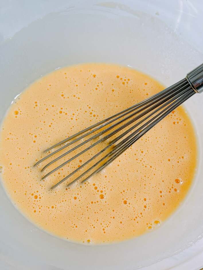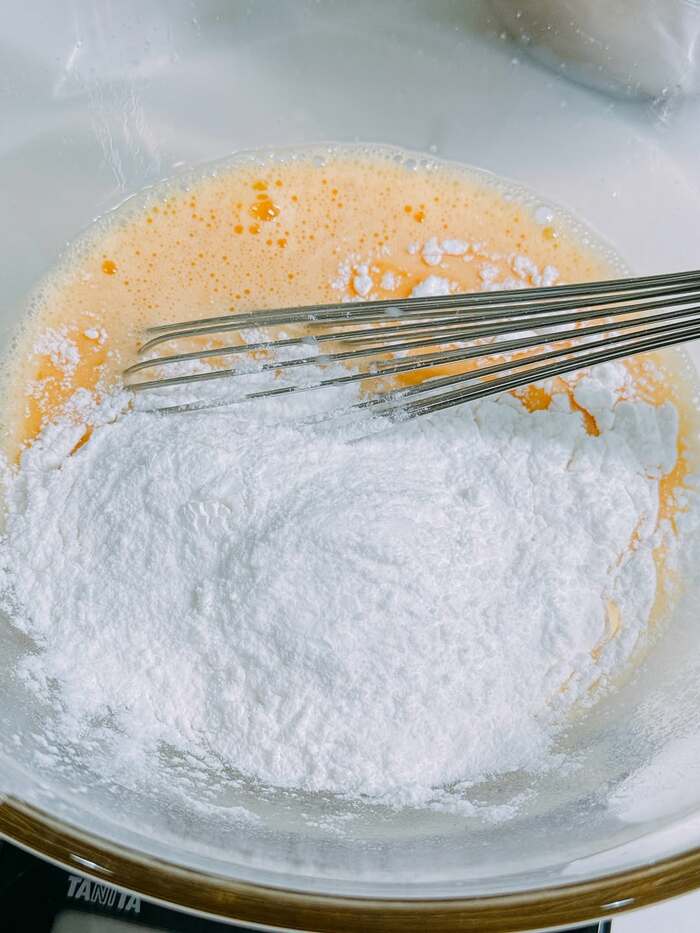 写真には、小麦粉を入れた生地を泡立て器で混ぜていく様子がうつっています。