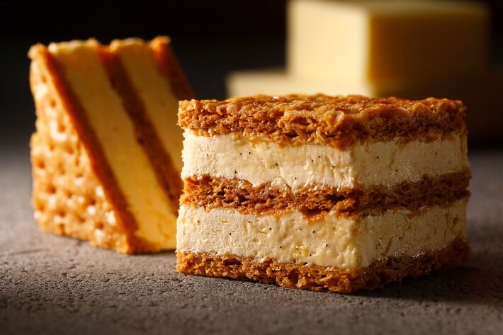 中でも「バターミルフィユ」は、横浜高島屋限定で販売していた特別な商品。この度、多くのお客様からご好評をいただき、再び期間・数量限定で登場いたします。さっくりと焼き上げた生地に、厳選したフランス ブルターニュ産の発酵バターとカスタードを合わせたムースリーヌをサンドした至高の味わいです。ふわっと香るバニラの上品な香りがバターのコクをより一層引き立てます。