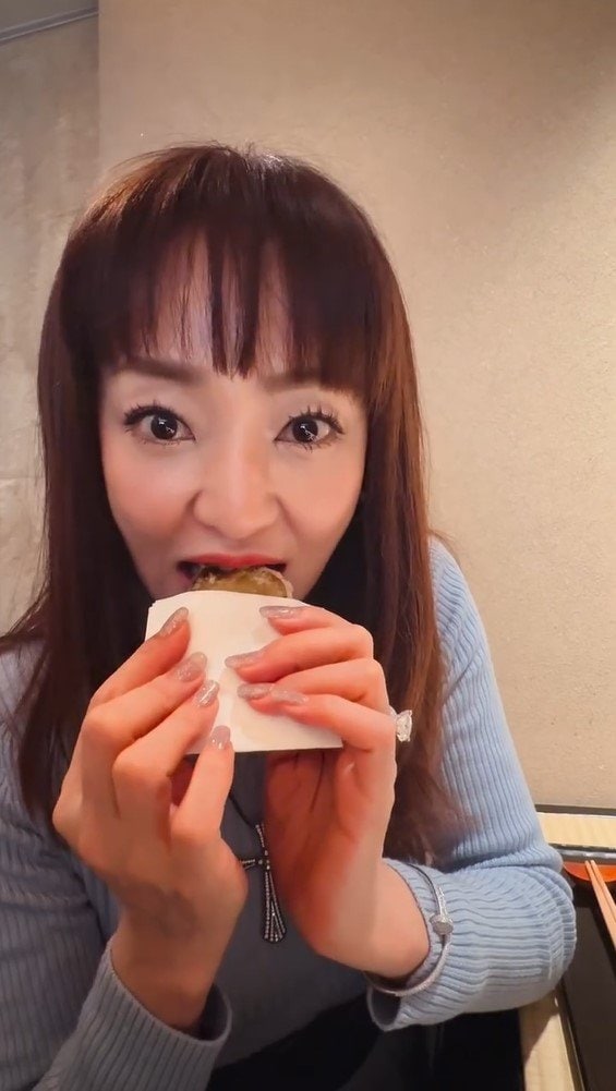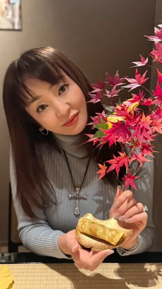 今回の投稿では「秋満載の美味なひと時でした」つづり、日本料理店を訪れた際のショットを公開。神田さんは、赤く色づいた紅葉の枝が印象的な銅色のお皿を持ち、お皿にのった薄焼き卵をクレープのように巻いた料理をカメラに見せ、顔を少し傾けて柔らかくほほ笑んでいます。