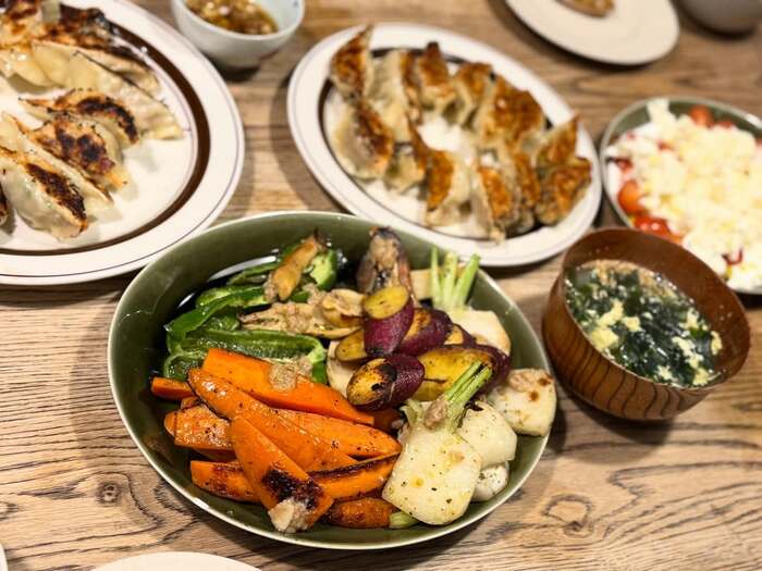 さらに写真にはにんじん・ピーマン・カブ・サツマイモなど彩り豊かな焼き野菜がドサっと盛られた大皿や、中華らしく卵とわかめのスープなども並び、しっかりバランスのとれた食卓となっています。