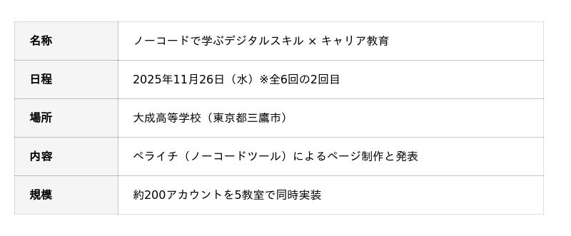 株式会社ペライチ(本社:東京都港区 代表取締役CEO:藤本旬)は、東京都三鷹市の大成高等学校にて、教育コンサルティング会社BYD社と協同で「ペライチ」を活用した「新しい学びの場」を実施しました。2022年度から始まった「総合的な探究の時間」導入を受けて、ノーコードツール「ペライチ」約200アカウントを配布し5教室同時で運用し、生徒が自ら企画立案したWebページを制作から発表まで行います。本件は、プログラミング教育必修化のもとで「作り表出するまでの距離を縮める」ノーコードツールの教育的価値を示す取り組みで、「社会で使えるアウトプット」へ学びを接続する実証事例です。