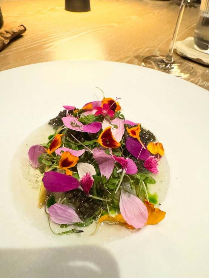 黄色やピンク、紫色の花びらが散りばめられた見た目が華やかなサラダ。花びらの隙間からはたっぷりのキャビアも見えています。