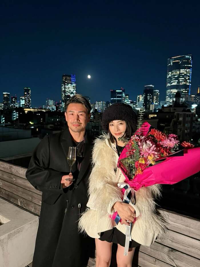 写真には真っ黒なロングコートに身を包みながらシャンパングラスを手に持つ魔裟斗さんと、その横でモコモコの黒い帽子を被り、シャギーファーが施された白いコート姿の矢沢さんが2人寄り添っています。矢沢さんの腕には、魔裟斗さんから贈られたという赤やピンク、黄色などといった色とりどりの花たちが抱えられています。