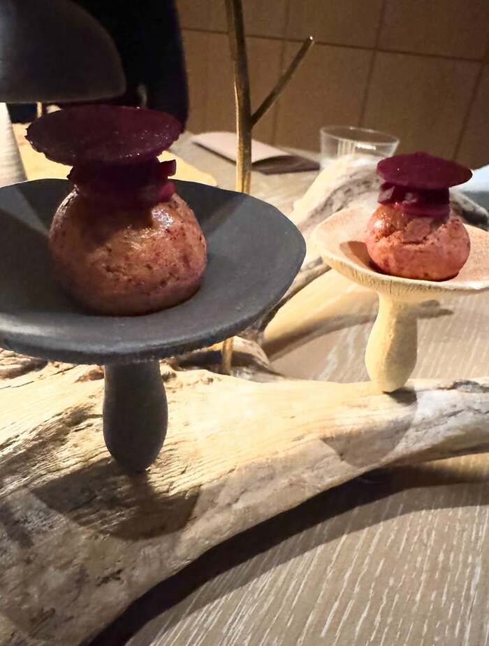 流木の上に生えたキノコをイメージしたのでしょうか。木の上に乗ったユニークなキノコ型の器には茶色いシューにビーツのようなものが乗った前菜や…。