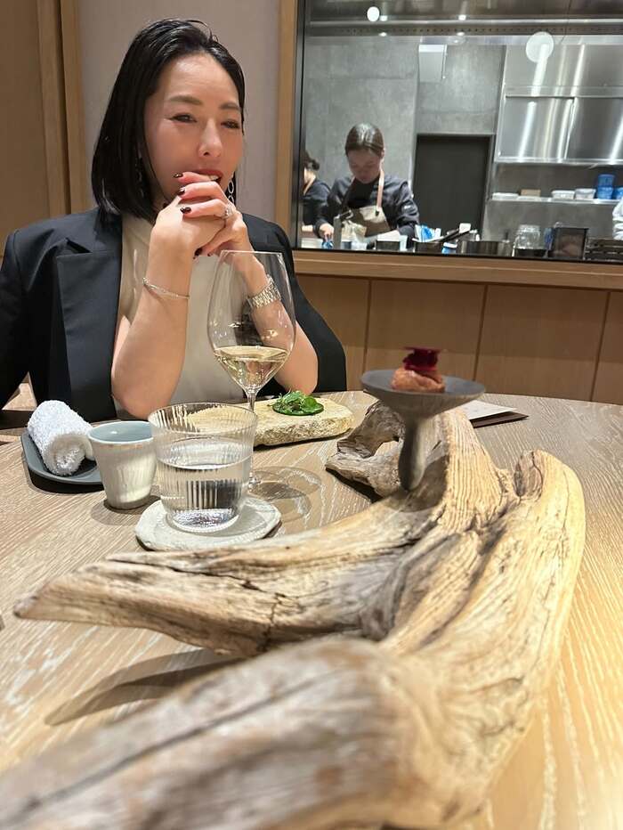 綺麗な木目に温もりを感じるテーブルの上には前菜が並びはじめ、「後ろではデザートを作ってくださっています 前菜が揃うまでの心弾む時間♡」と、矢沢さんは白ワインをたしなみながら料理を待つ姿を見せています。
