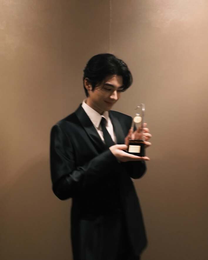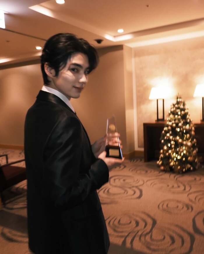 投稿された写真には、光沢が美しい黒のサテンスーツに身を包み、受賞トロフィーを手に持つ響矢さんの姿が!