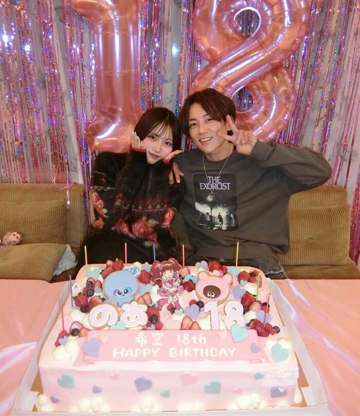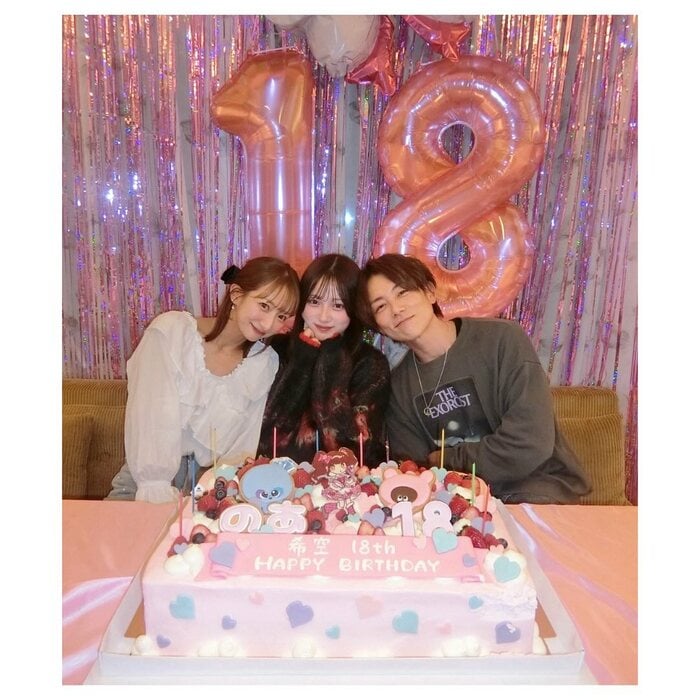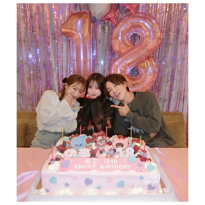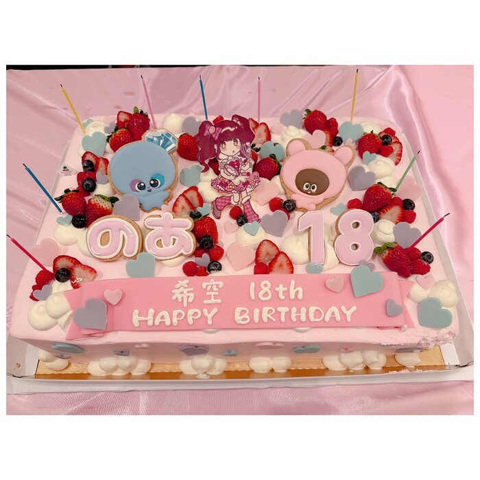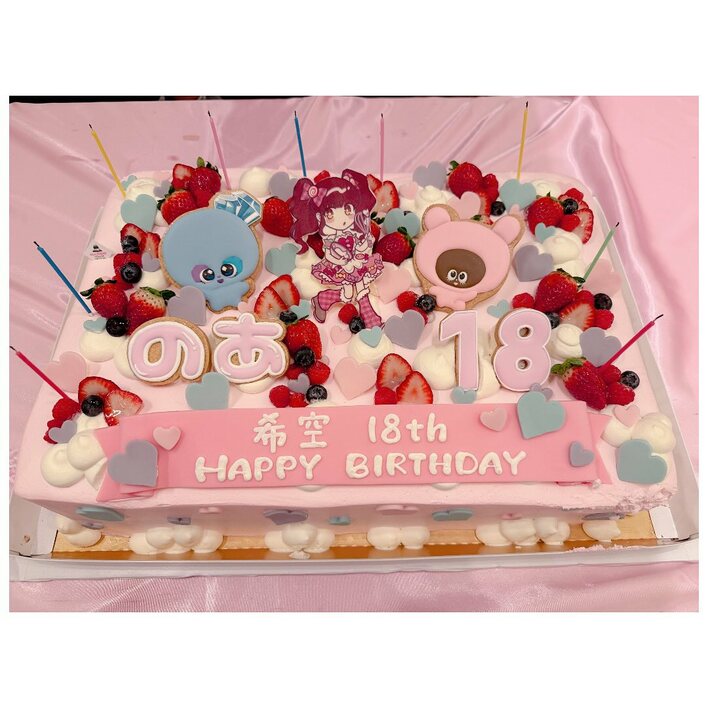 ケーキは、希空さんがアンバサダーを務めるアニメキャラクターや、希空さんをイメージし描かれたキャラクターなどが飾られ、ピンク色のクリームにイチゴやブルーベリーが散りばめられた超特大ケーキをオーダーして作ってもらったとのこと。