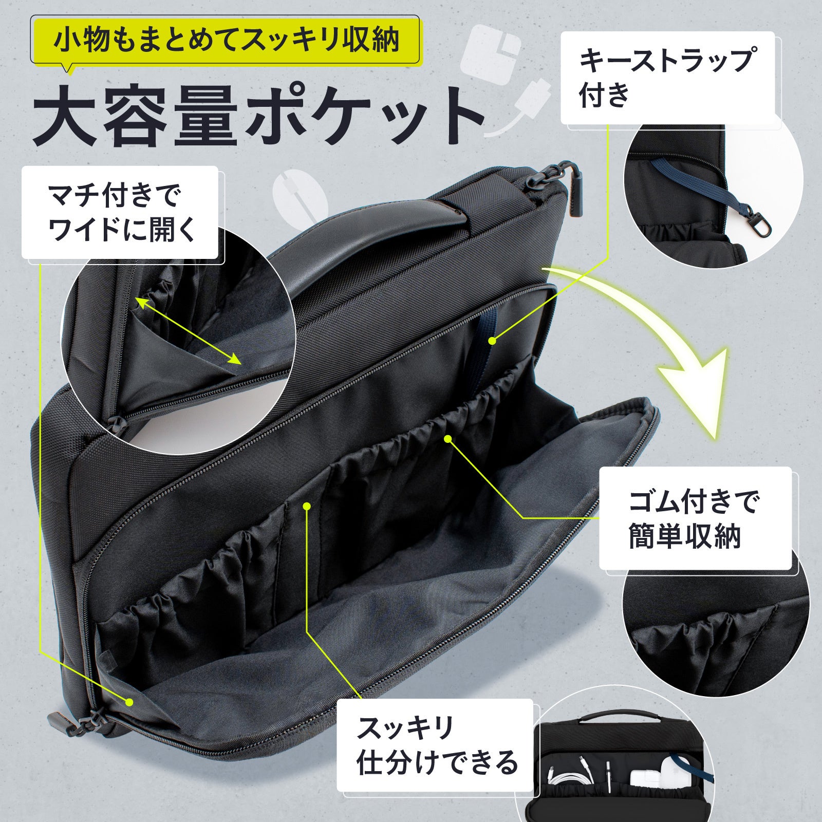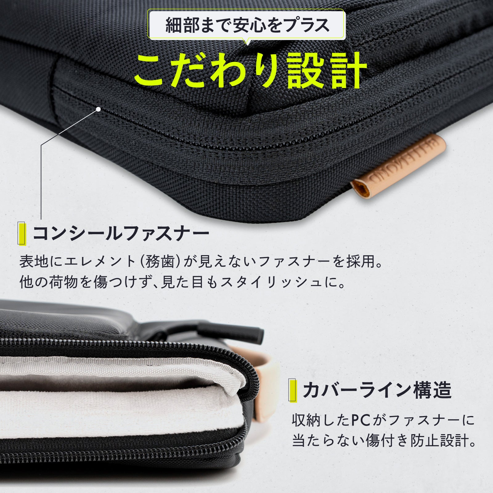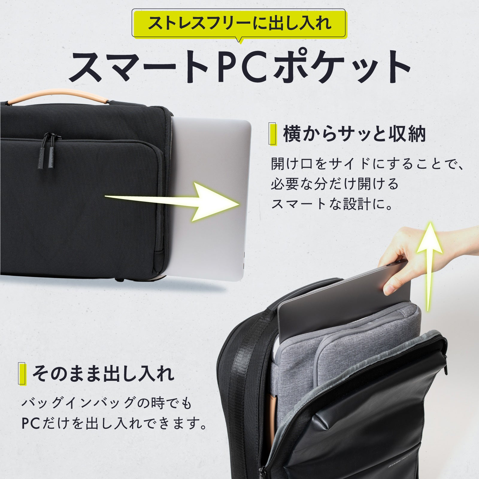 また、PCポケットは横からサッと出し入れできるサイド開き構造で、バッグに入れたままPCだけを取り出すことも可能。ビジネスシーンでもスムーズに使える設計です。