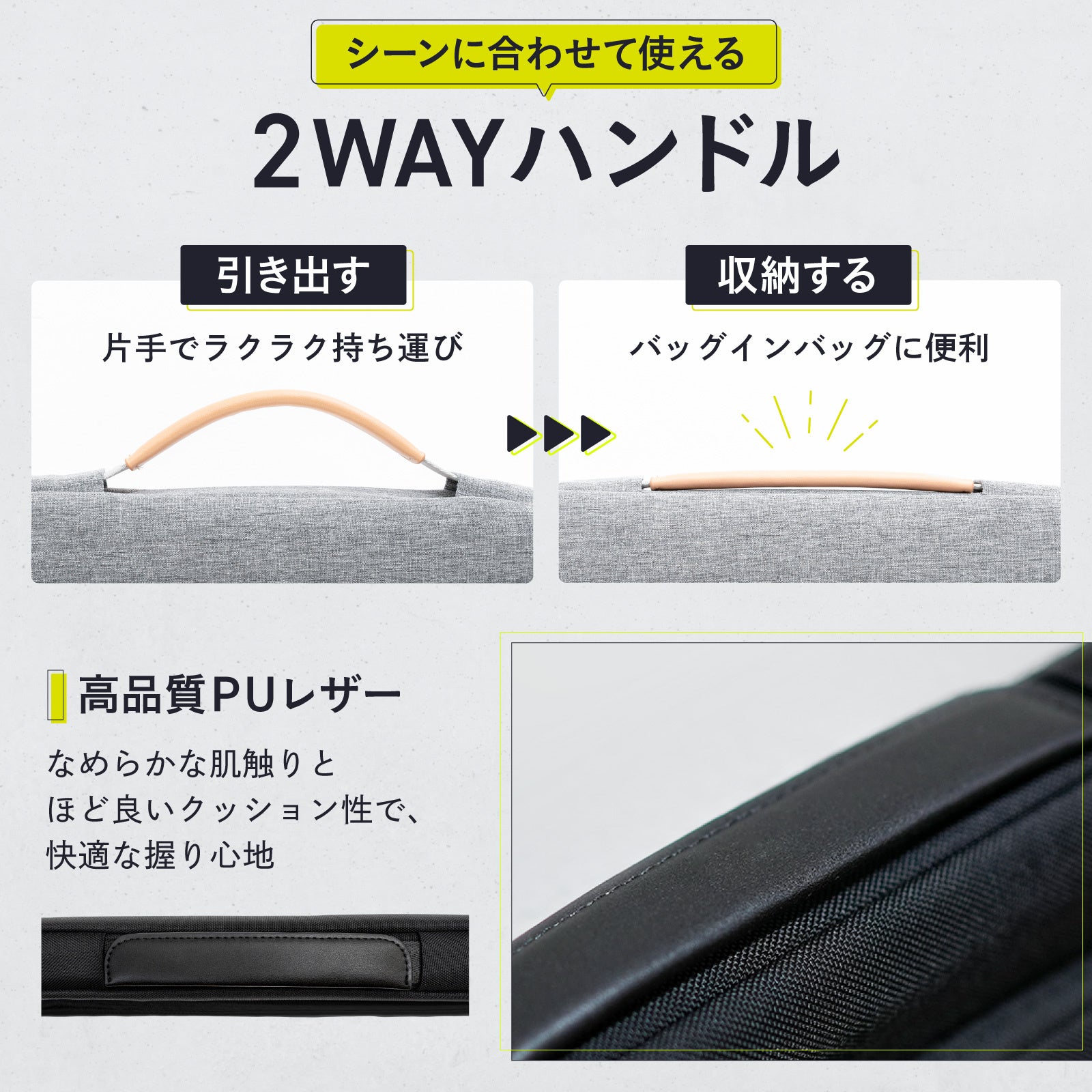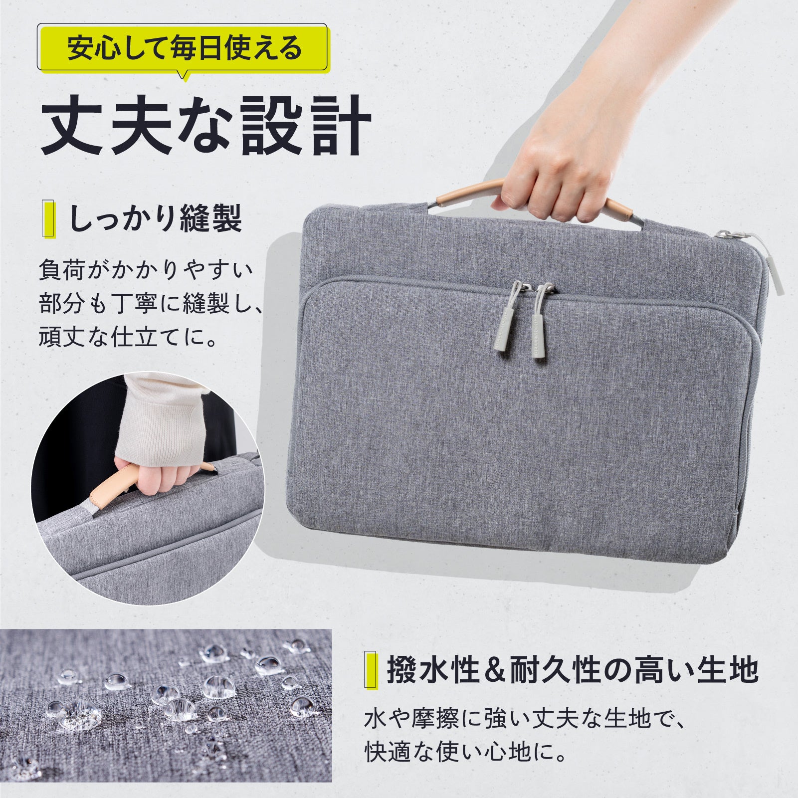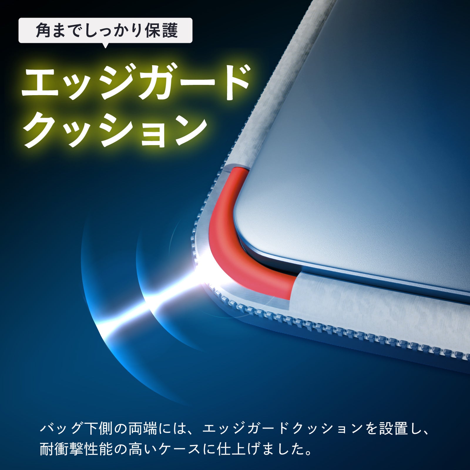 衝撃吸収クッション・大容量ポケット・ハンドル付きで“ぴったりサイズ”の持ち運びを実現。マウス・充電器・ケーブル・モバイルバッテリーなどの小物収納に便利。毎日の通勤・通学に心地よさを。プレゼントにも最適
