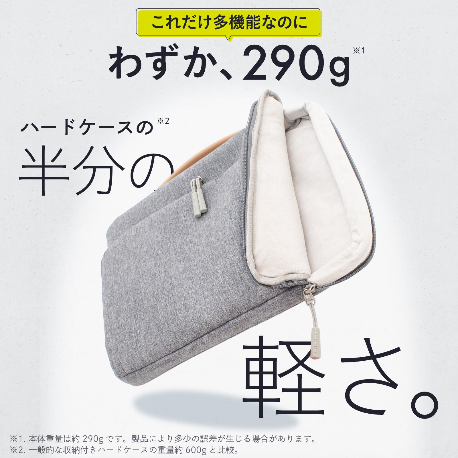 厚手クッションによるやさしい保護、起毛素材の内装、片手で持てる2WAYハンドル、軽量290gの扱いやすさなど、日々の持ち運びに“安心”と“心地よさ”をプラスする新モデルです。
