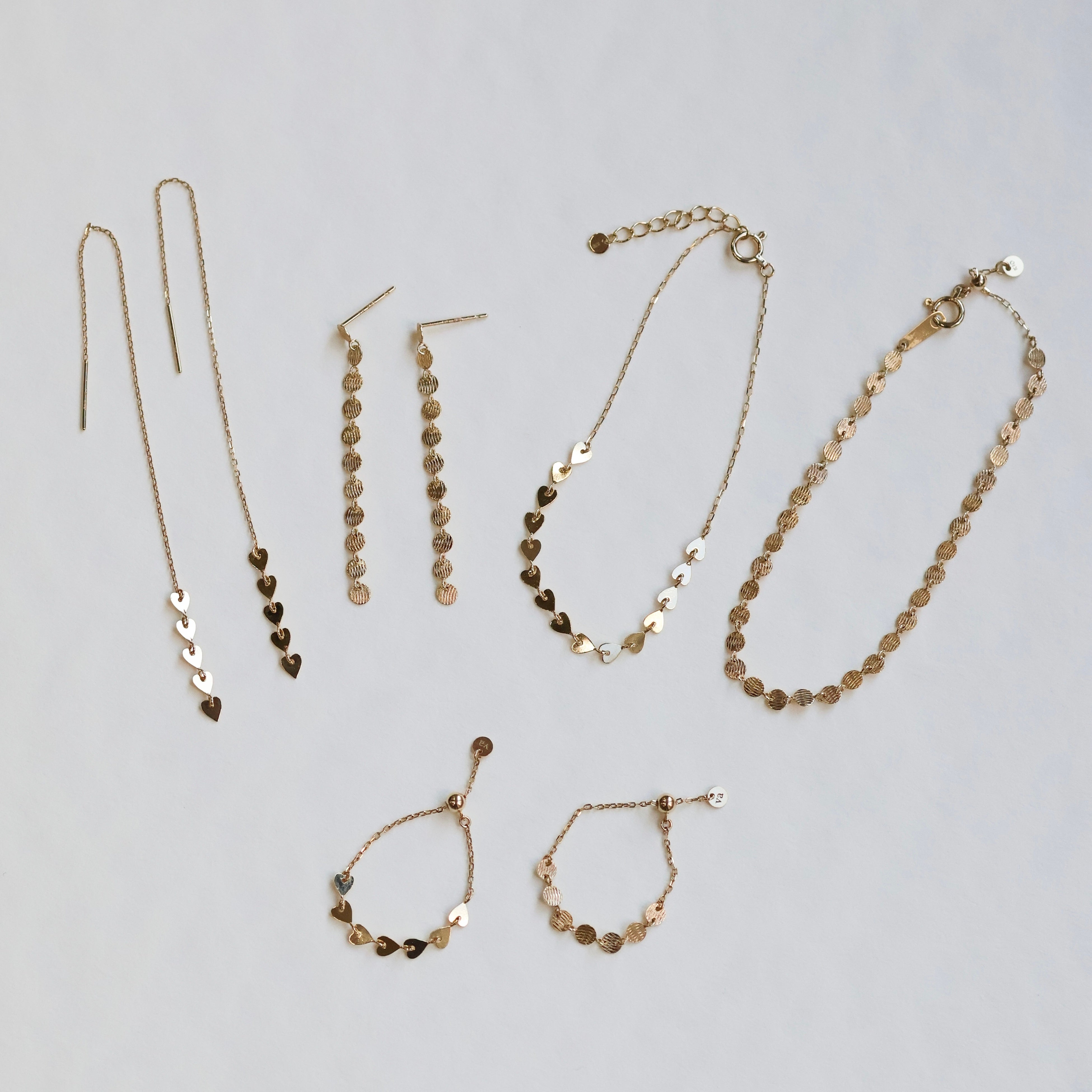 すっきりとしたシルエットで甘さを抑えた大人可愛いハートモチーフと、プレートに繊細なカットを施しモダンで洗練された印象のサークルモチーフがラインナップ。ゴールドの軽やかなきらめきが、美しく素肌に馴染みます。