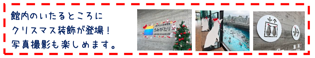 上越市立水族博物館『うみがたり』では、2025年12月1日(月)から12月25日(木)の間、「うみがたりのクリスマス2025」を開催します。館内には、クリスマスツリーやサンタ帽が至る所に装飾されクリスマス一色に彩られます。