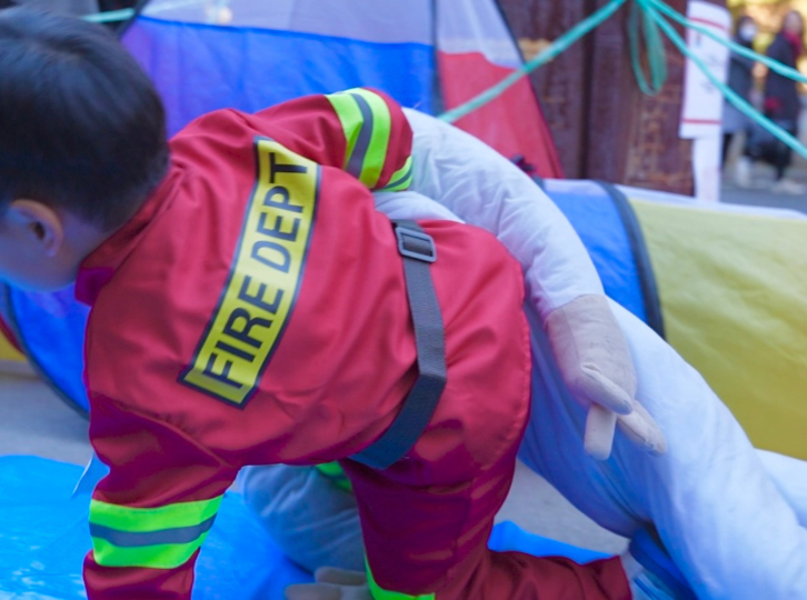 物語は、サンタがプレゼントを届ける道中に火事や地震に遭遇してしまい、進めなくなってしまうところからスタート。参加者の“こども消防士”たちは、3つの会場を巡りながら「消火」「ロープ」「レスキュー」の3大チャレンジに挑戦し、サンタを助け出します。