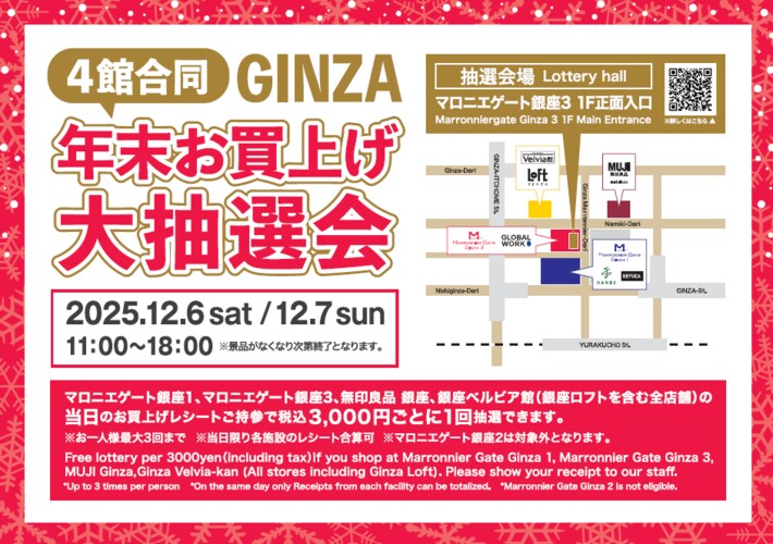 マロニエゲート銀座1、マロニエゲート銀座3、無印良品銀座、銀座ベルビア館(銀座ロフトを含む全店舗)の当日のお買い上げレシートご持参で税込3,000円ごとに1回抽選できます。