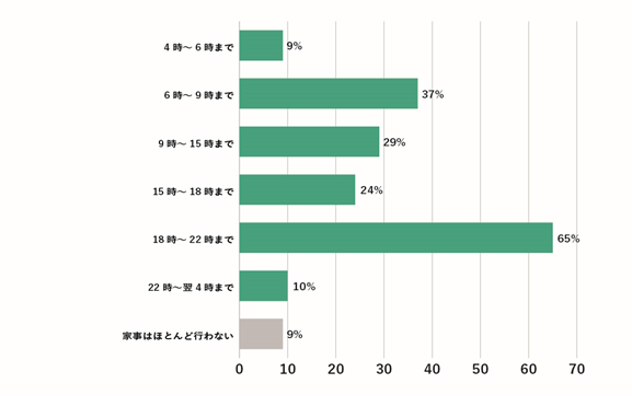 - 夜家事のピークは「18時~22時」共働き・単身世帯で、仕事や育児を終えた夜に家事が集中。特に「食後の片付け」「食事の準備」「洗濯」などが夜間に多く行われています。