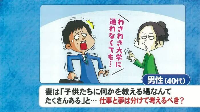 ほか、「教師になる夢を叶えるために、早期退職して大学に入りたいと言ったら妻に反対された」という40代男性や、「顧問の肩書に釣られて転職したが、仕事内容が思っていたものと違って後悔している」という60代男性の悩みも紹介された。