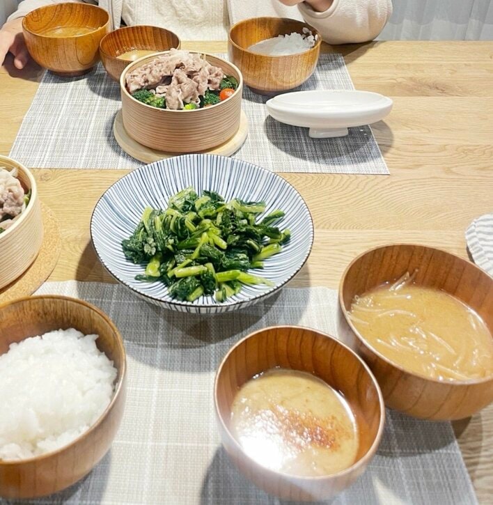 麗禾さんの分と2人分用意されたご飯の真ん中には大きなお皿に盛られた野沢菜か何かのおひたしも。