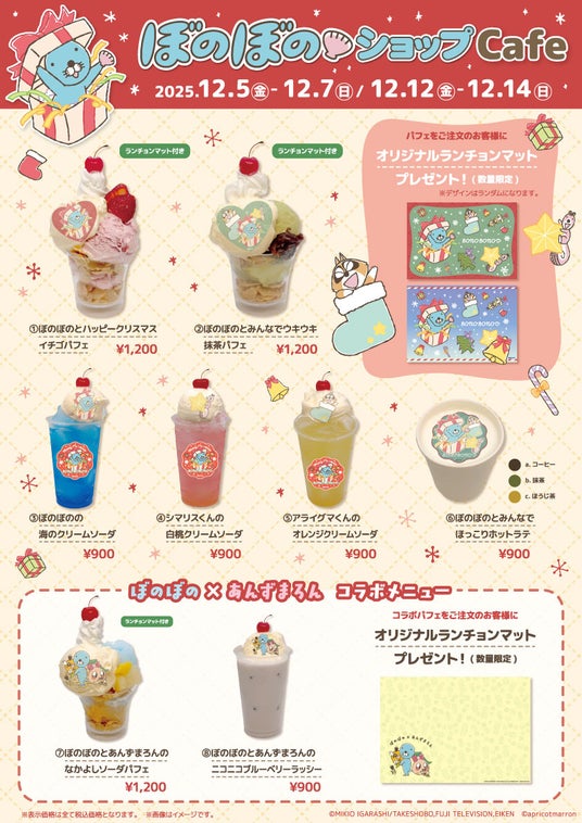 ぼのぼのショップに併設されたキッチンスペースにて、 週末限定のテイクアウトカフェを開催します! クリスマステーマの2種類のパフェや、 キャラクターをイメージしたドリンクを提供します。 「ぼのぼの×あんずまろん」のコラボメニューも! パフェをご注文いただいた方には、