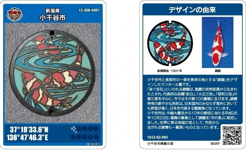 当市は、「錦鯉」と「片貝まつり」をデザインした2種類のマンホールカードを制作しています。