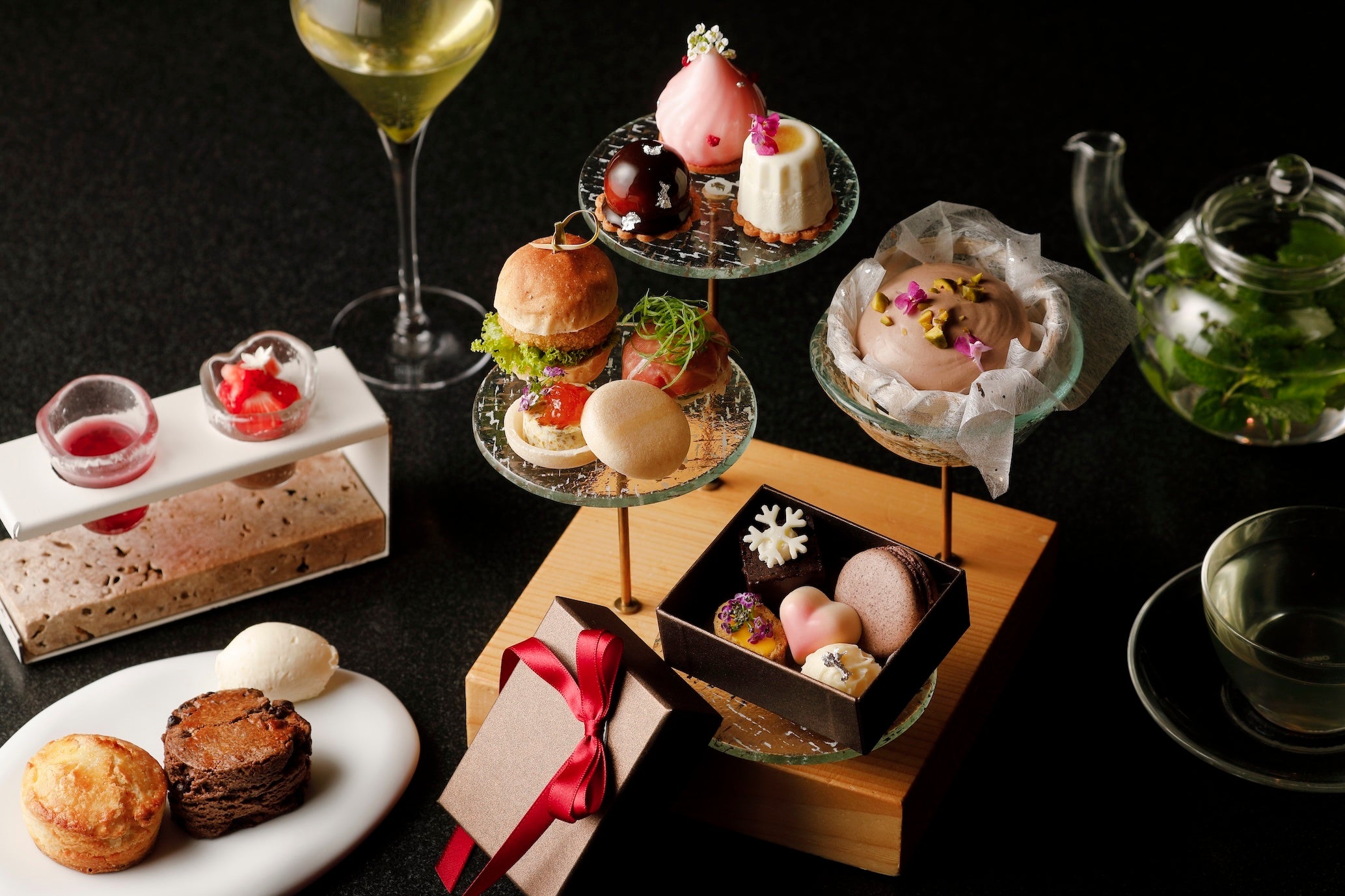 【内容】スイーツ 9種 /セイボリー 3種 /スコーン 2種 /カシスソーダ&ドリンク 12種