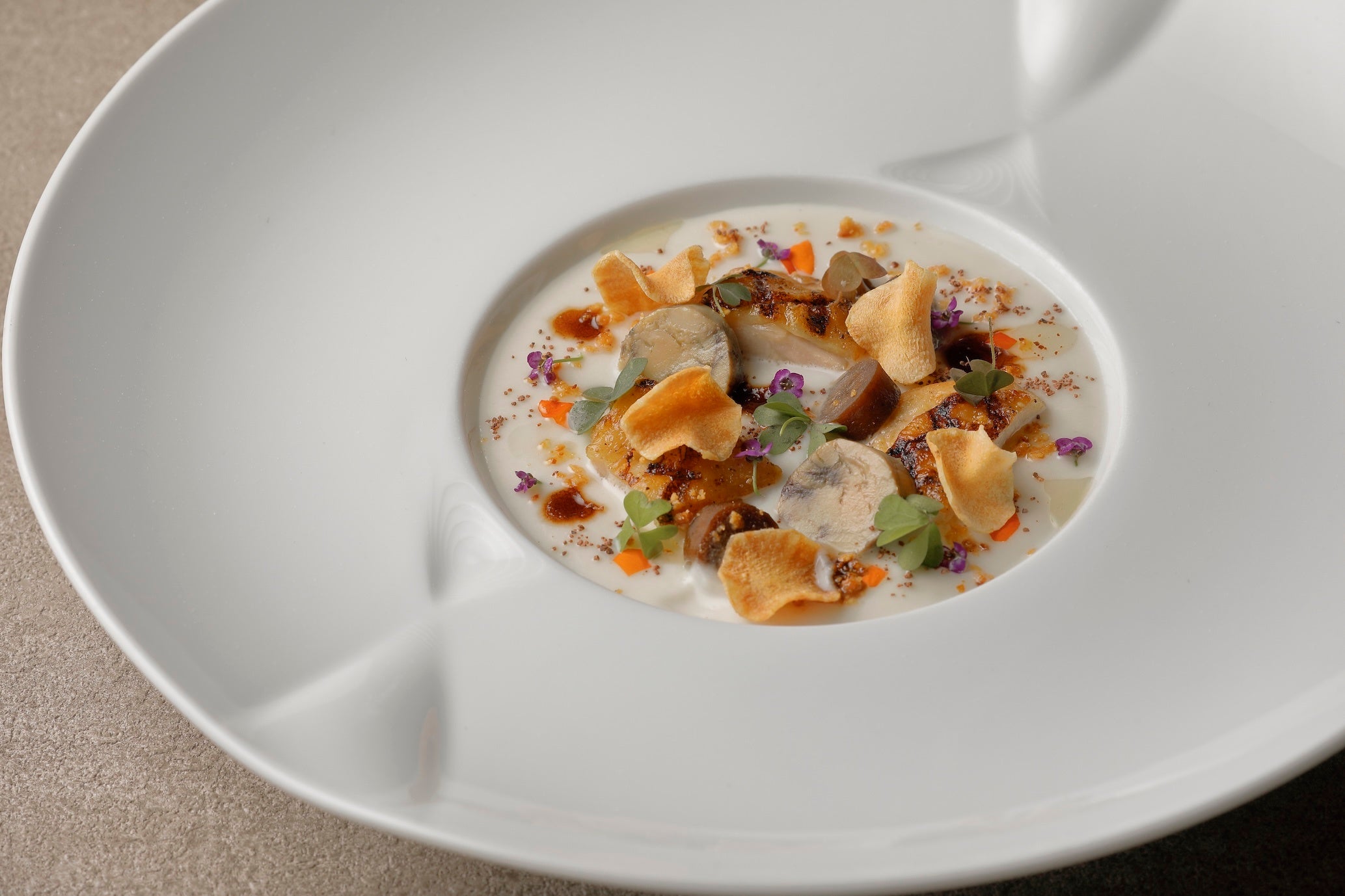 冬の宝石を散りばめたような菊芋のスープ「菊芋 丹波地鶏 エスプレッソ」は、華やかな素材のマリアージュが魅力の一皿。丹波地鶏やフォアグラのテリーヌ、エスプレッソの重層的な香りや旨みが広がり、至福の味わいを紡ぎ出します。「帆立貝 カリフラワー トリュフ」は、旬の帆立貝にカリフラワーのピュレやベーコン、トリュフを合わせてご堪能ください。ココナッツのムースに生姜のソルベを添えたデザート「苺 ココナッツ 生姜」は、雪のように淡い口どけと爽やかな余韻が印象的な一品です。シーンに合わせて選べる多彩なコースやアラカルトでお愉しみください。